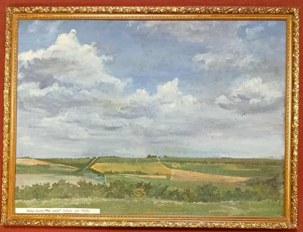 Peisaj rural de câmpie, redat într-o manieră realistă. Lucrarea surprinde întinderea ogoarelor și dealurilor sub un cer vast, acoperit de nori albi și gri. Tonurile de verde, ocru și albastru creează o atmosferă luminoasă și calmă.