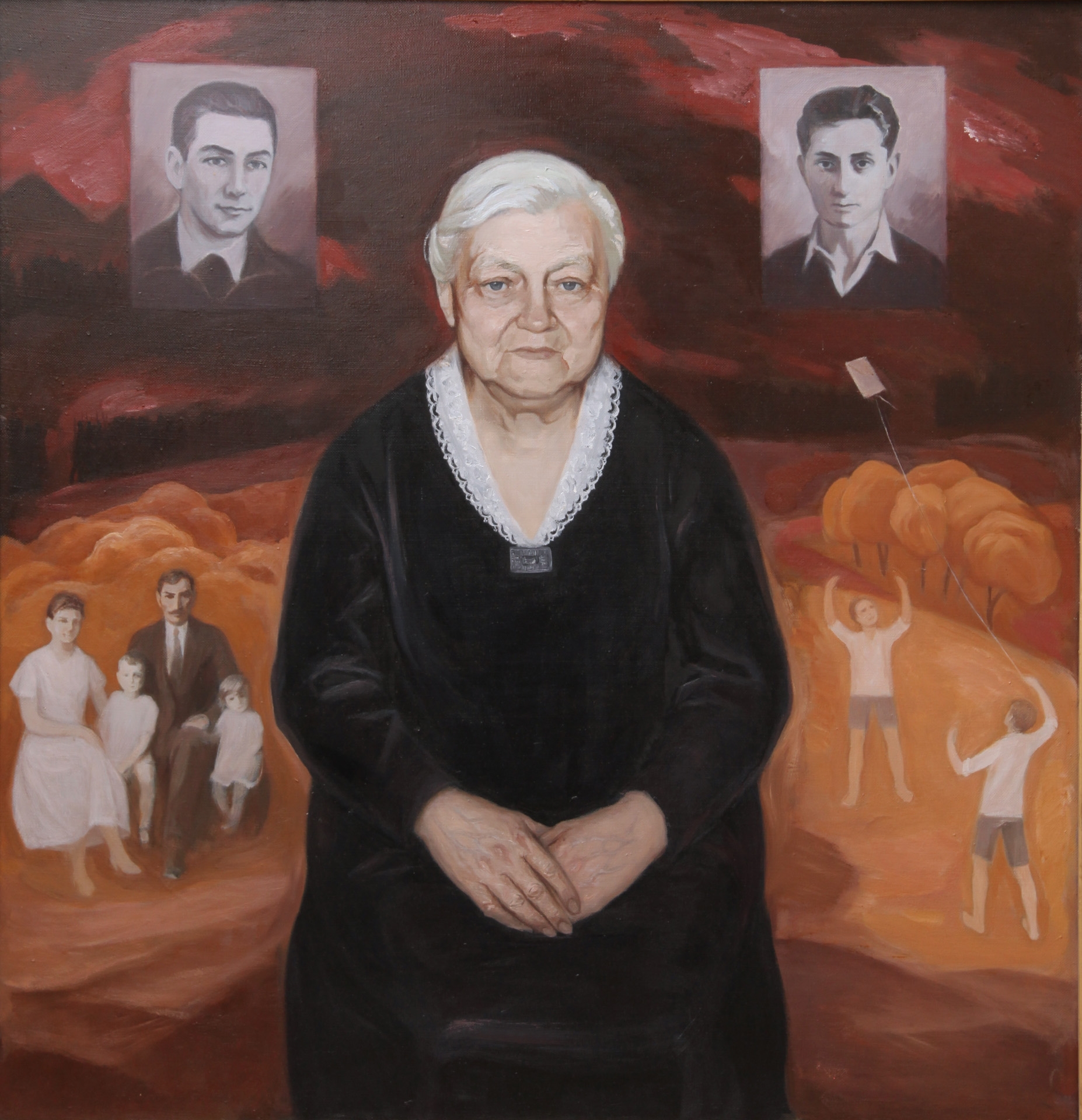Portret de femeie în etate, aşezată, văzută frontal, cu mîinile împreunate înainte, lăsate pe genunchi. Poartă rochie neagră, cu guler alb. E flancată sus de 2 fotografii, iar în registrul de jos - compoziţii cu personaje.