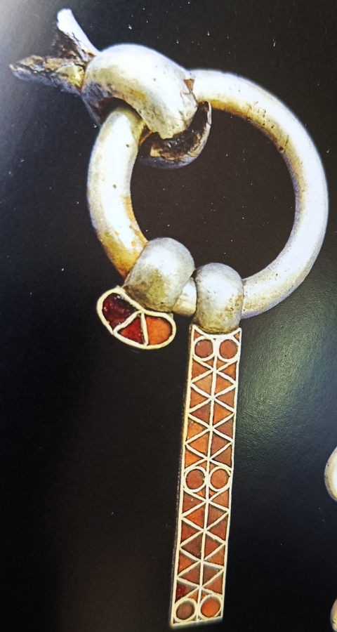 Zăbale reprezentând o veriga de argint, de la care este fixată, printr-un laț (clemă), o placă îngustă de aur, cu încrustări de email colorat. Veriga este confecționată din fier, acoperită cu un strat de argint. De veriga de argint sunt fixate trei cleme, una dintre care este de fier, acoperită cu argint. Cealaltă clemă, la fel este de argint, fiind unită, prin sudare cu fragmentul unei aplici de aur, de formă semi-ovală, cu trei secțiuni (una triunghiular0, celelalte două semi-ovale) umplute (incrustate cu email). Pe aplică lungă de 60 mm, decorul est compus din secțiuni triunghiulare și circulare, incrustate cu email colorat, cu nuanțe de la vișiniu la portocaliu.