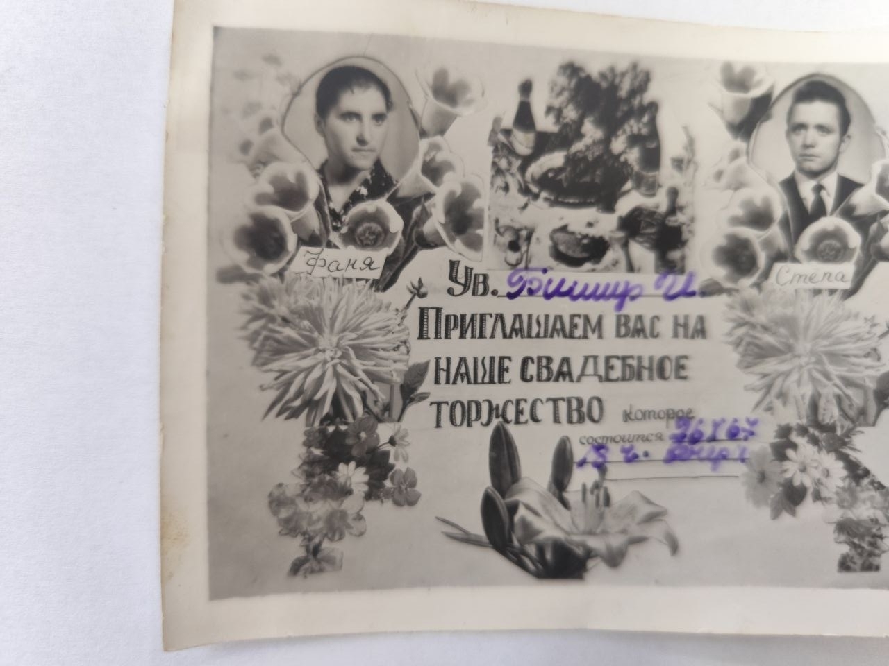 Фотография — это изображение, созданное с помощью фотоаппарата, где световые лучи фиксируются на светочувствительной поверхности или в цифровом виде для получения визуального отображения объекта или сцены. Старинное свадебное приглашение .В центре написан текст :" Уважаемые Бишир И. приглашаем Вас на наше свадебное торжество : состоится 26.Х.67г. Слева и справа расположены фотографии жениха и невесты, окруженные декоративными цветами. Присутствуют запись "жених и невеста" написаны от руки. Приглашение украшено традиционным свадебными и праздничным столом. Такие приглашения были популярными в СССР . Они изготавливались типографским способом ,а фотографии жениха и невесты вклеивались или вмонтировались в шаблон. Благодаря этому приглашение становилось личным и памятным. Данный предмет принесла в дар Тулуш Мария Ив. из личного архива.