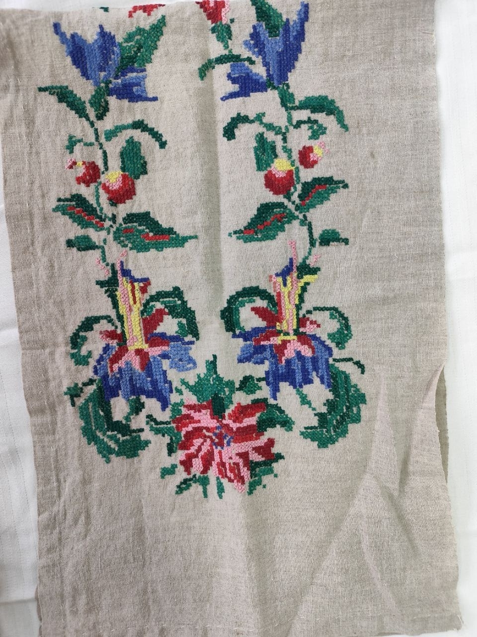Вышивка-полотенце — это декоративное полотенце, украшенное вышивкой, часто используемое в традиционных обрядах и для украшения интерьера. Полотенце(пешкир-диал)-это традиционное полотенце ,украшенное ручной вышивкой . Изделие изготовлено из льна серого цвета. Вышивка расположена из обеих сторон полотенца, что характерно для пешкиров -узоры зеркально отражают друг друга образуя орнаментальную композицию. Центральный мотив состоит из цветов ярких оттенков синего и красного, розового и зеленного цвета. вышивка выполнена крестиком шерстяными нитками мулине на домотканом льне. Пешкир традиционно использовался в обрядовых целях (например: на свадьбах ,религиозных праздниках ,и крестинах) ; как украшение или покрывали иконы .хлеб и т.д. .; в быту как декоративное полотенце . Такой пешкир несет элементы народного орнамента и символики; цветы означают жизнь ,красоту, и плодородие , а симметрия узора символизирует гармонию и равновесия. Данный предмет принесла в дар Кайряк Анастасия из личного пользования, предмет достался ей от бабушки в наследство.