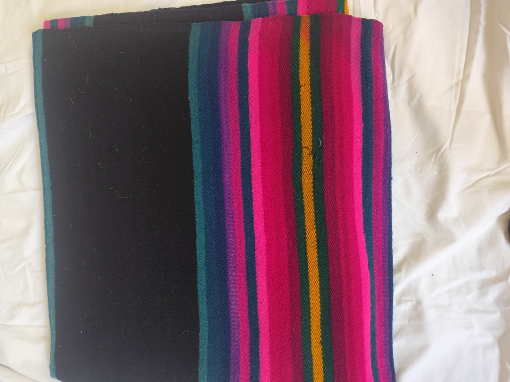 Домотканый ковер - дорожка сделанный на ткацком станке. Основа дорожки черного цвета .Он сделан виде полосы еще контрастные. По краям иду полосы насыщенные оттенков : малиновый фуксия, фиолетовый ,синий и другие. Они шились из шерсти окрашивание натуральными красителями . Домотканые дорожки такого типа использовались в деревенском быту как покрывало на лавках ,кроватях сундуках ,или для создания уюта в доме. Данный предмет ткала мама дарительницы Трандабула Надежда, принесла в дар Малак Федора.