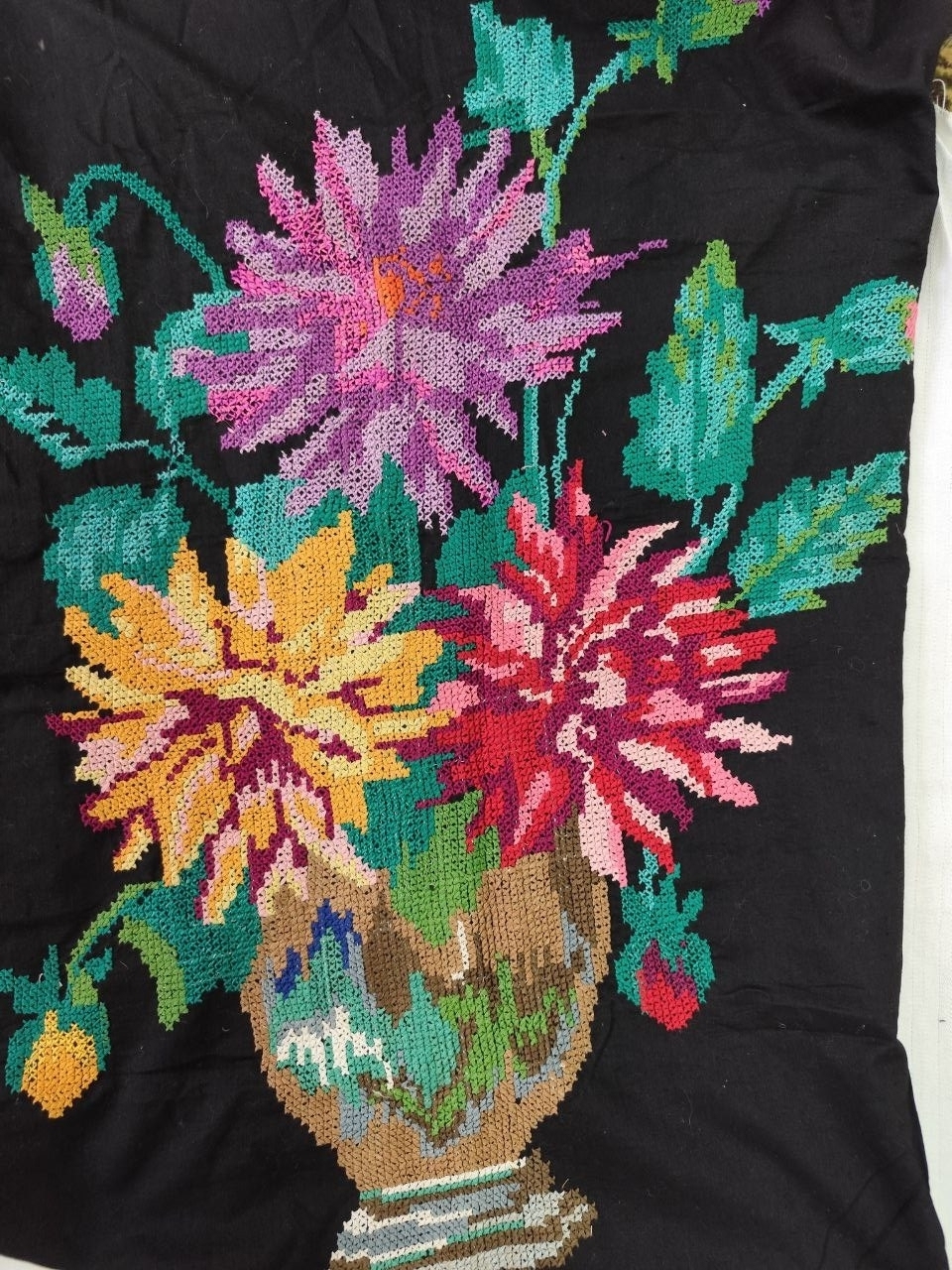 Вышивка - это вид декоративно-прикладного искусства, заключающийся в украшении ткани или другого материала узорами, выполненными с помощью иглы и нитей или других материалов. Вышивка - ручная выполнена в крупном крестом на черном полотне . На вышивке изображен букет крупных георгинов в вазе . В центре - пышные цветы ярких оттенков : пурпурного , фиолетового, желтого и красного цвета. Даная вышивка была создана для декоративного настенного панно. Данный предмет принесла в дар Кайряк Анастасия , предмет достался ей от бабушки по наследству.