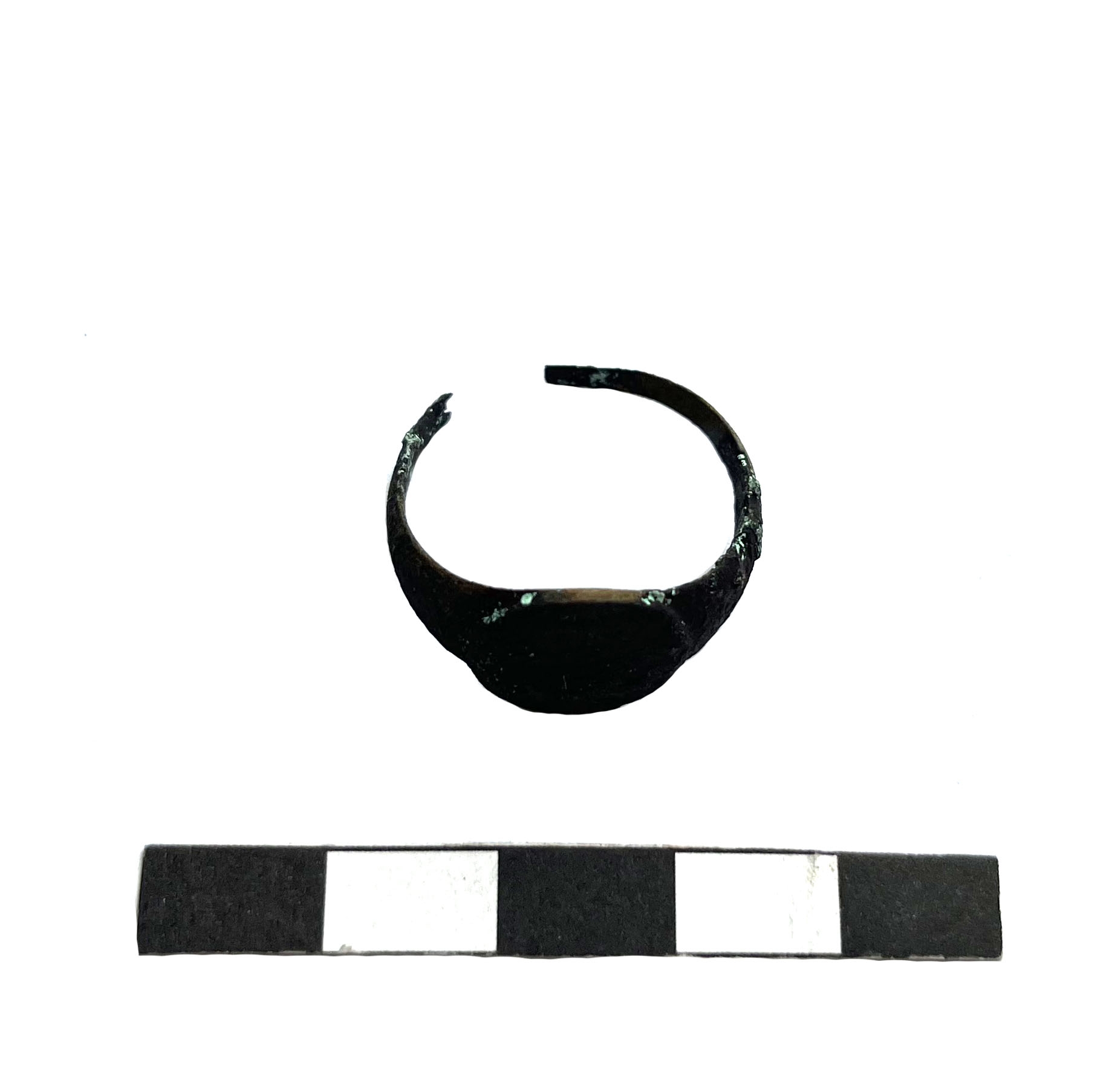Inel din bronz, prevăzut cu chaton circular cu diametrul de 13 mm. Inelul este prelucrat din placă subțire și are o porțiune ruptă. Din cauza uzării puternice, nu s-a păstrat gravura de pe chaton.