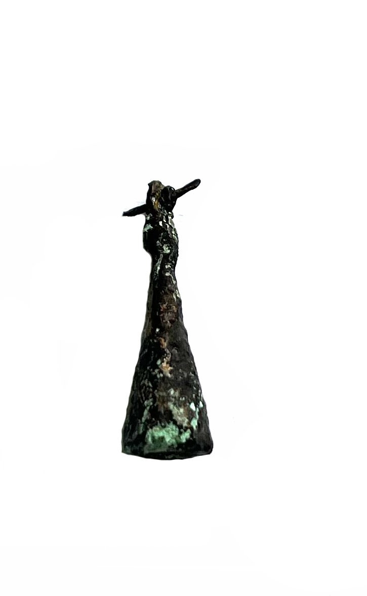 Două pandantive de tâmplă turnate din bronz. Acestea au formă piramidală circulară, prevăzută la capătul îngust cu un orificiu de suspensie cu diametrul de 1,5 mm. În cazul unuia din exemplare inelul orificiului s-a păstrat fragmentar. Diametrul bazei este de 9 mm. Suprafața pieselor este acoperită cu pete mici de patină de culoare verde. Au fost descoperite sub craniul defunctului.