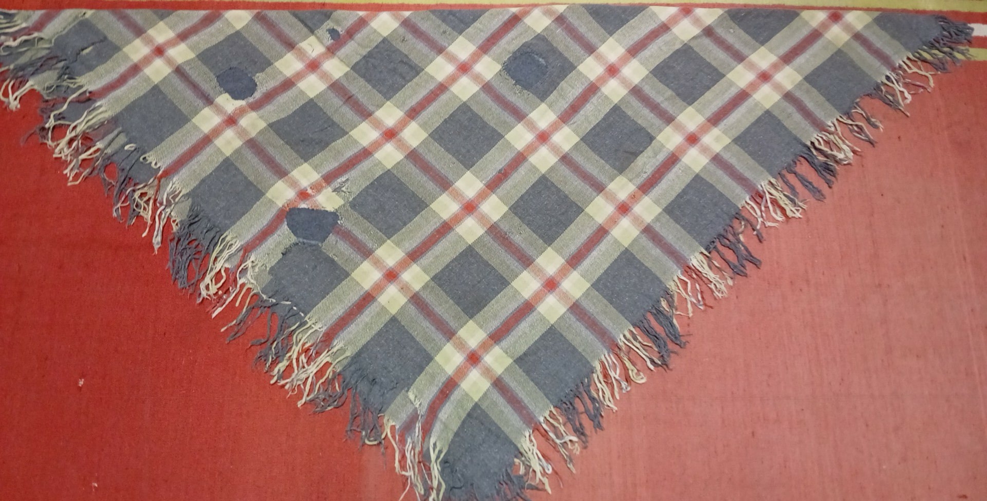 Șal tradițional din lână, cu formă patrată, decorat cu model în carouri alb-roșu-albastru, terminat cu franjuri pe margini.