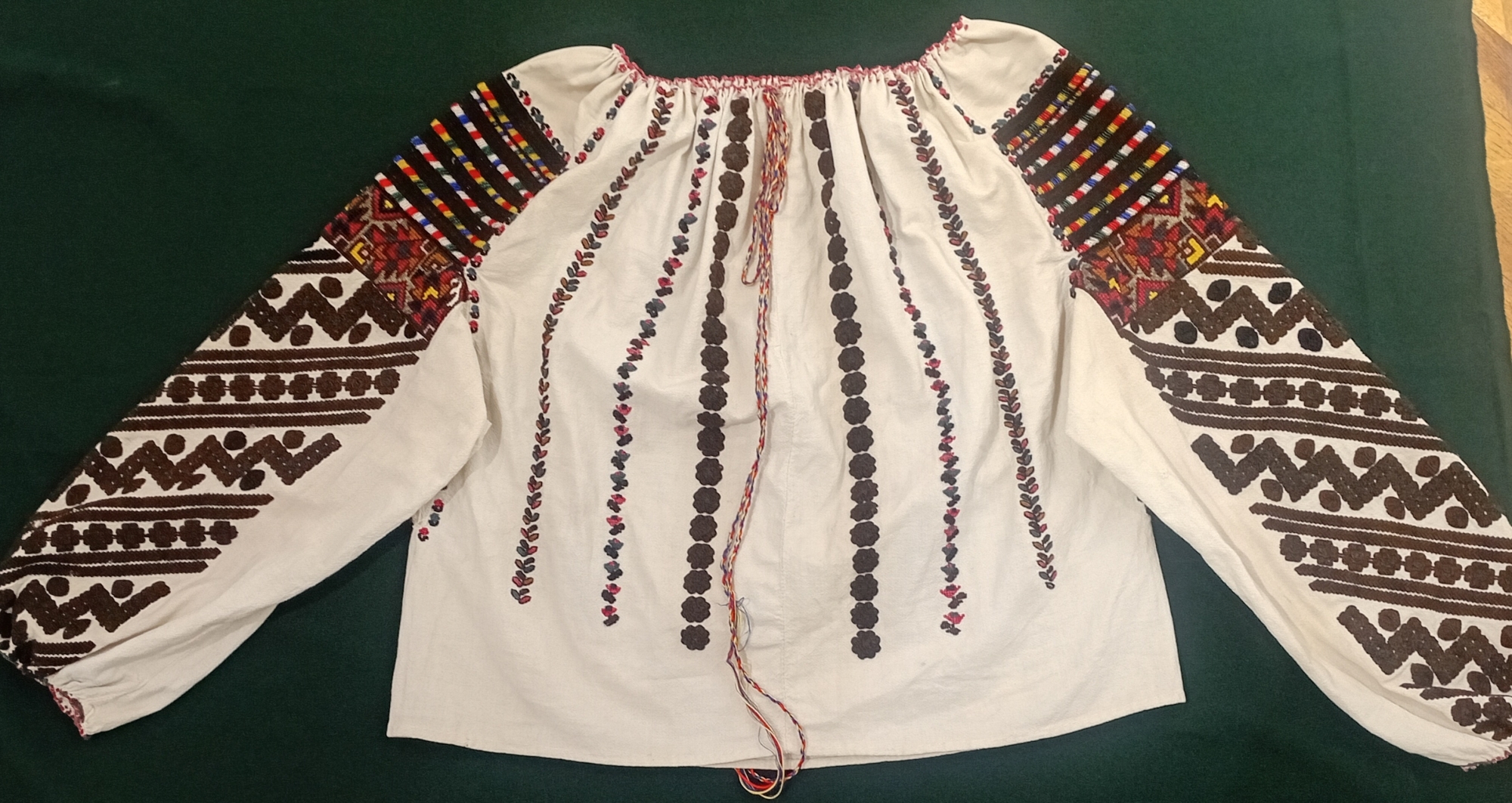 Ie tradițională cu altiță, din in, cu croi drept și guler încrețit. Pe părțile din față și din spate ale piesei: câte 2 coloane verticale de ornament floral, reliefat. Spre exterior: șiruri cu motive florale mici. Altița: cu fond închis la culoare și decorată cu benzi orizontale ondulate, confecționate din mărgeluțe. Sub altiță: încrețul, decorat cu motive geometrice policrome. Partea inferioară a mânecii: cu ornamente bogate, dispuse simetric. Motivele ornamentelor: geometrice și stilizate - „Brăduțul”, puncte, forme florale. Ornamentele de pe piesă: confecționate din ață de lână și muline. Tehnica confecționării ornamentelor de pe piesă: cruciuliță, semi-cruciuliță, brodate pe fir, „lănțișor”. Cromatică: alb, roșu, verde, albastru, galben, brun.