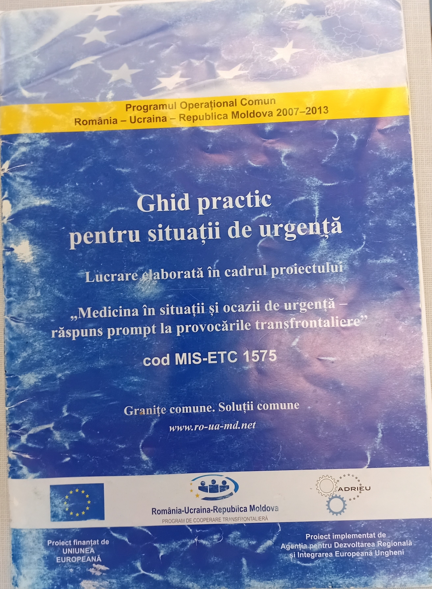 Ghid practic pentru situații urgente. Piesa - lucrare a proiectului „Medicina în situații și ocazii de urgență - răspuns prompt la provocările transfrontaliere”. Piesa - 1 Program de cooperare transfrontalieră între România - Ucraina - Republica Moldova 2007 - 2013. Piesa - 1 copertă compusă din 2 părți, tipărită în limba engleză și în limba română. Pe piesă: informație generală despre proiect și numerele de telefon a 6 instituții partecipante la Program. Cromatcă: alb, negru, albastru, galben, roșu.