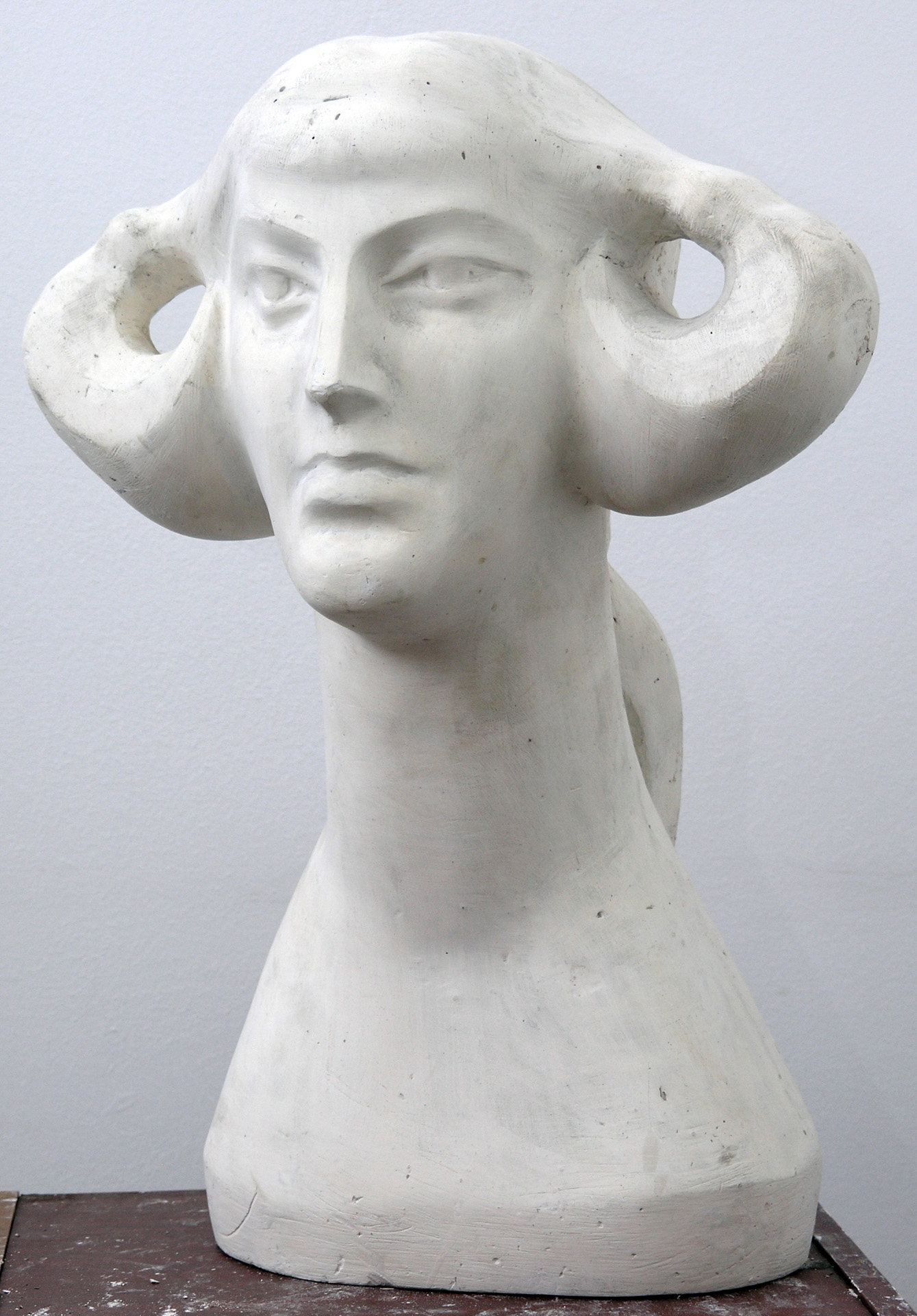 Portret de femeie. Păr bogat, strîns în 2 cosiţe. Gît lung.