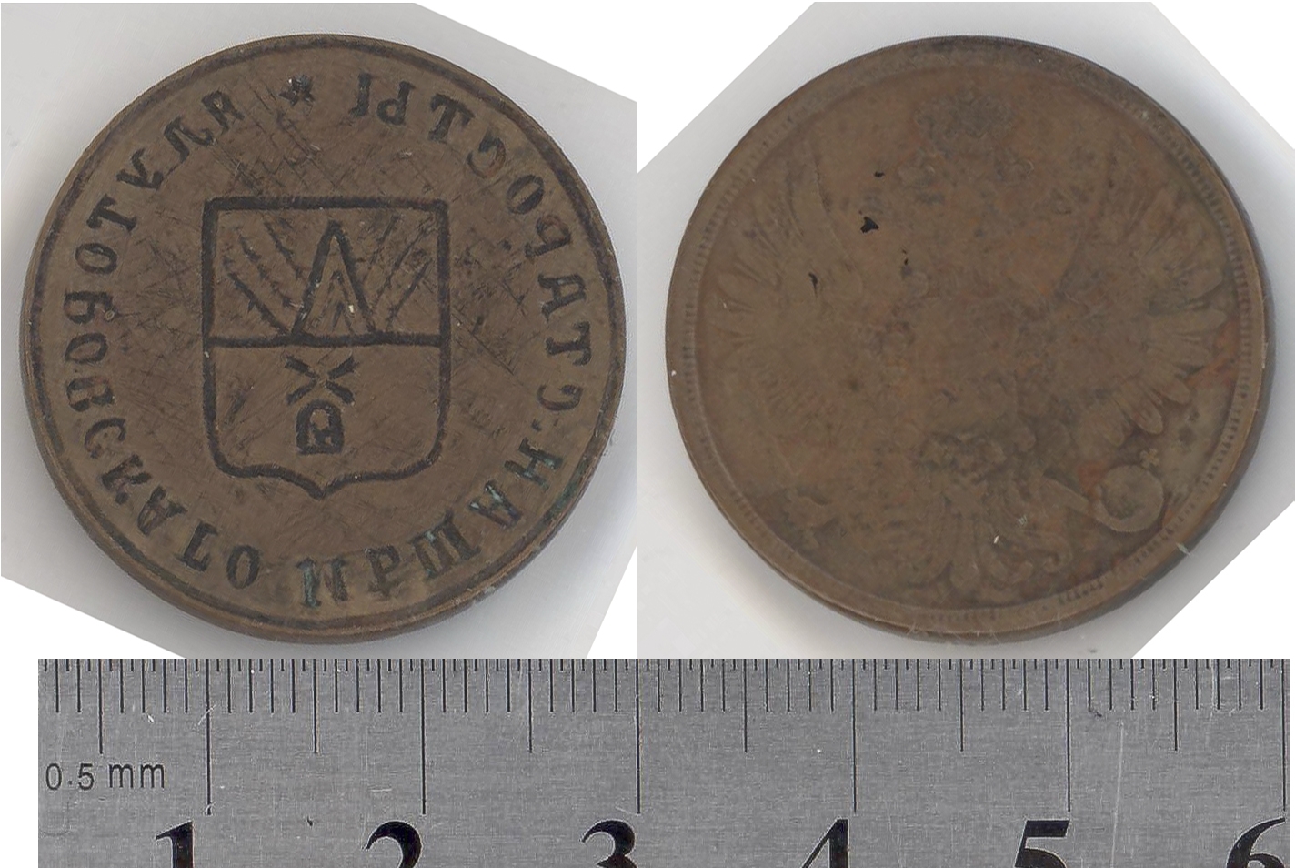 circular. Avers - gravat pe centru un scut dreptunghiuar, avînd 2 cadre cu diverse imagini. Legendă: de la stg la drp (cu chirilice) - Ialutorovskago Meşcianskogo Starostî.