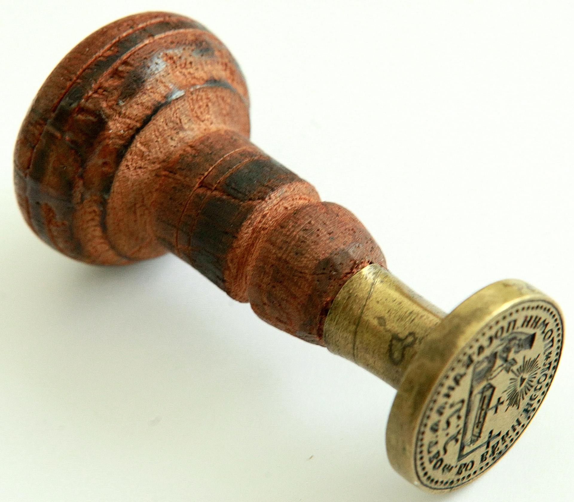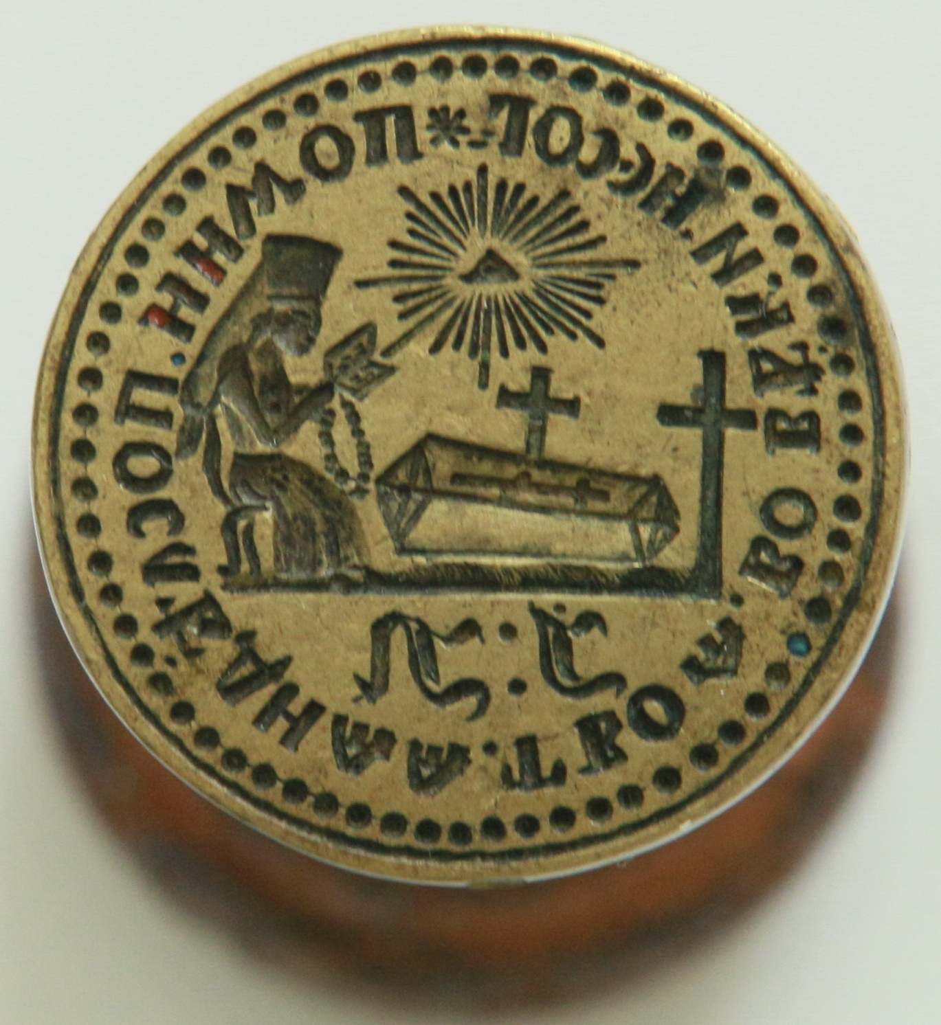 cu talpă rotundă și mîner conic, avînd terminație în formă de pălărie. Pe matricea sigilară într-un cerc perlat conturat de inscripții, e gravat un sicriu și 2 cruci, un călugăr citește; timbrat sus de Ochiul Atotvăzător; jos în exergă - monogramă.