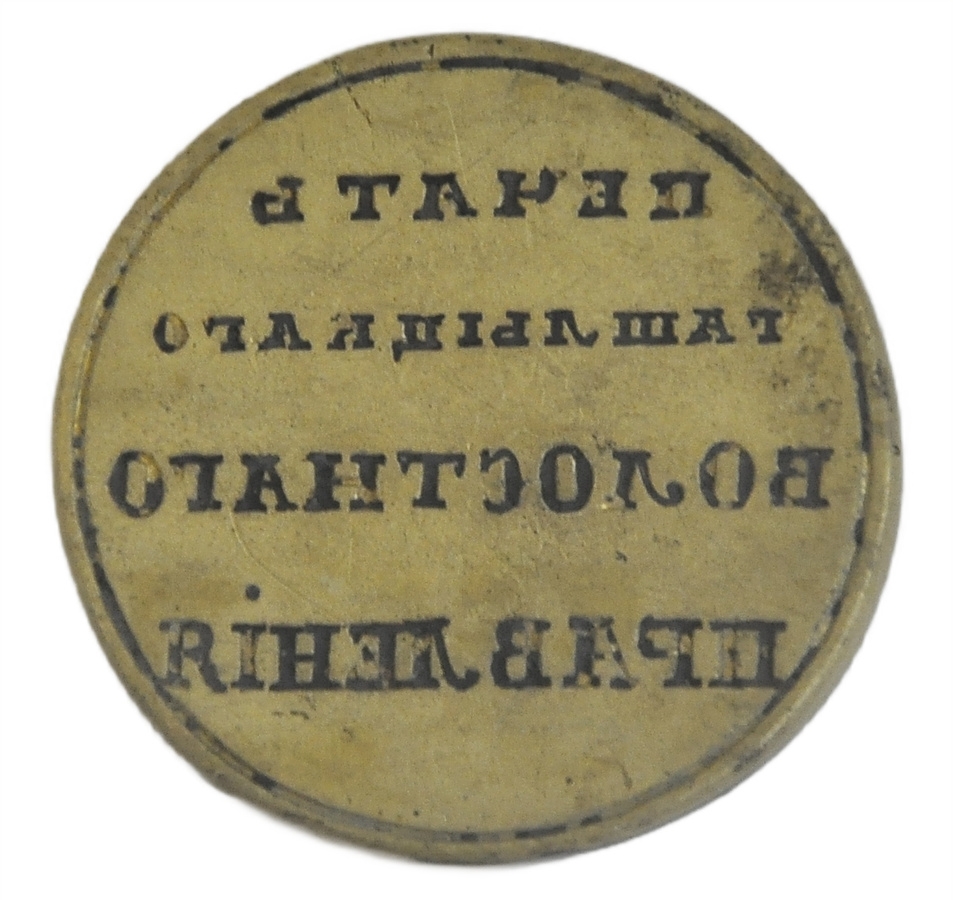 Matrice sigilară rotundă (fără emblemă). În spațiul sigilar, într-un cerc liniar, s-a înscris legenda în patru rânduri: „PECHAT/TASHLYTSKAGO/VOLOSTNAGO/PRAVLENIJA” (ПЕЧАТЬ/ТАШЛЫЦКАГО/ВОЛОСТНАГО/ПРАВЛЕНИЯ / SIGILIUL ADMINISTRAŢIEI DE VOLOSTE TAŞLÂC).