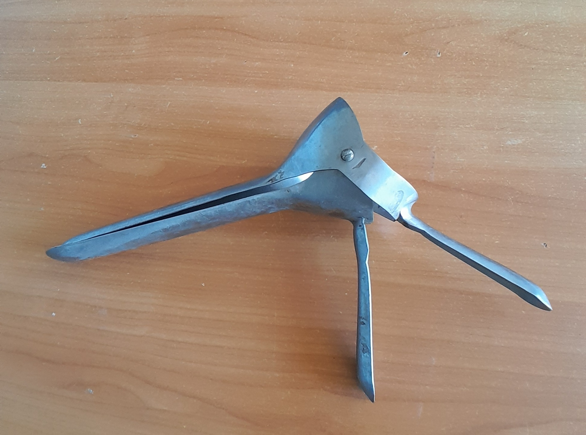 Oglindă endoscopică pentru vite, era folosită pentru însămânțarea vacilor; constă din două plăci și tub flexibil.