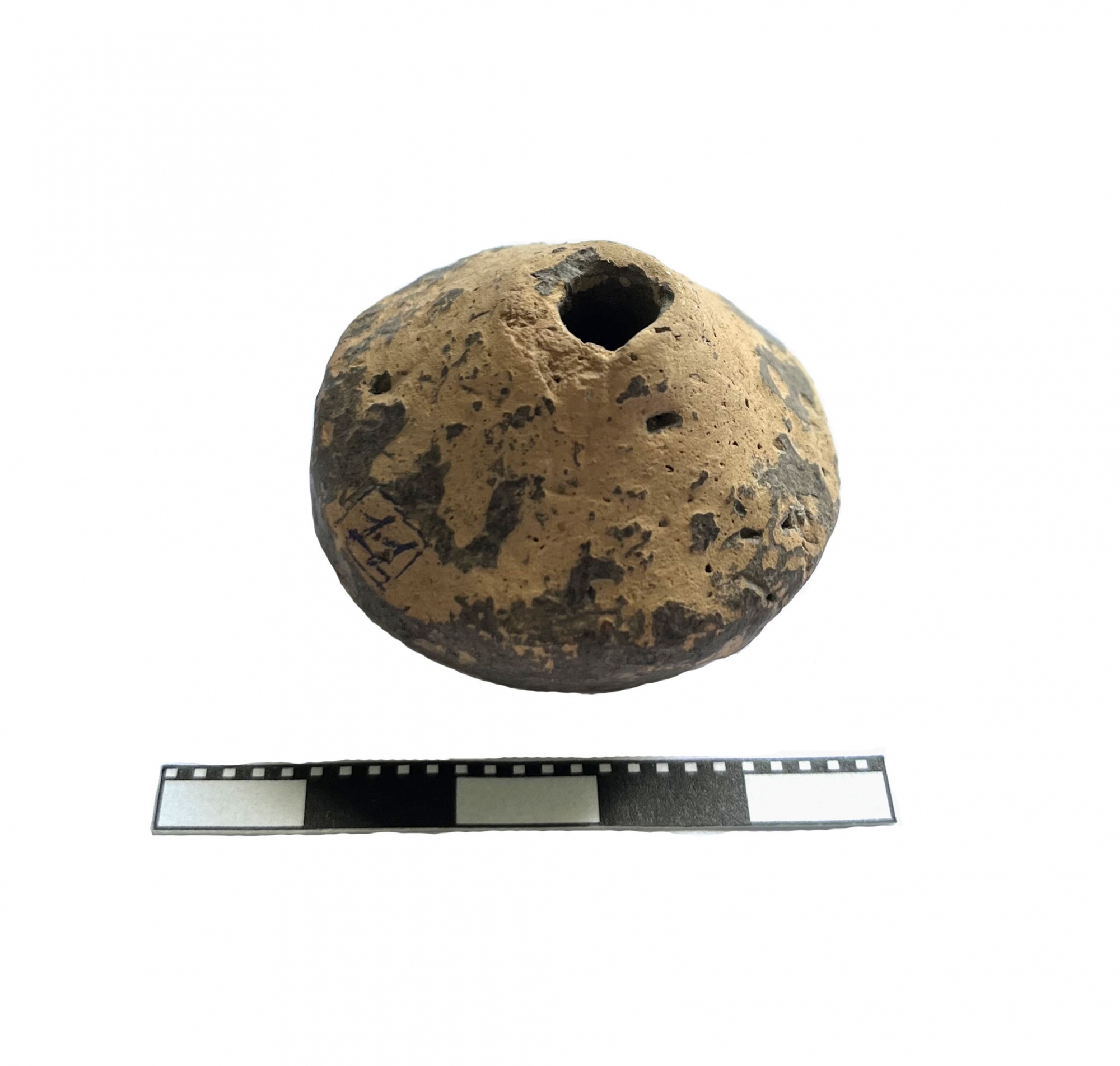 Fusaiolă bitronconică, modelată din pastă de lut în amestec cu nisip. Are o latură conică și alta finisată printr-o bază lată, convexă. Este prevăzută cu orificiu median cu diametrul de 5,5 mm. Arderea s-a făcut suficient și uniform. Piesa este de culoare gălbuie și are suprafața parțial acoperită cu depuneri de culoare cafenie.