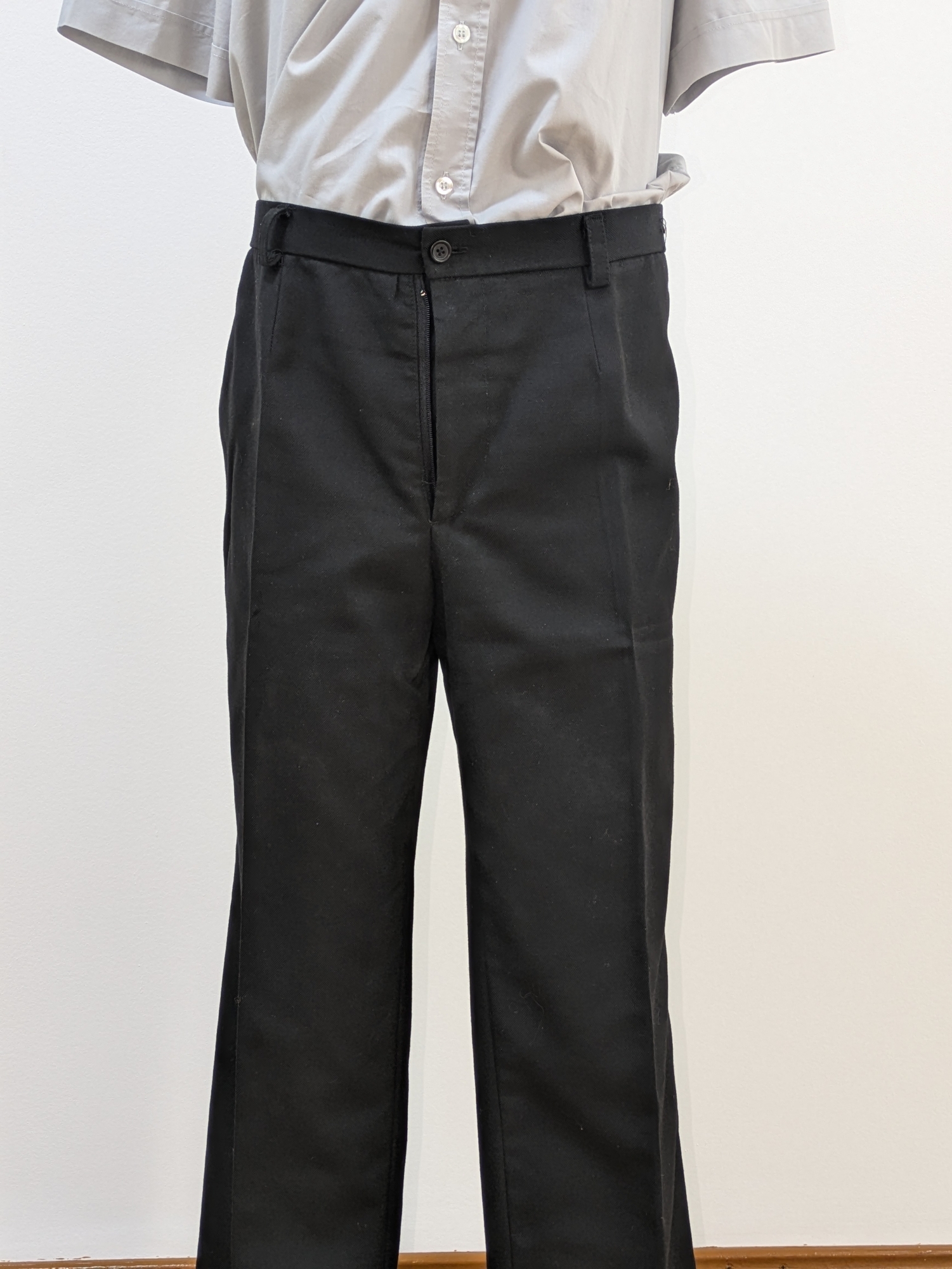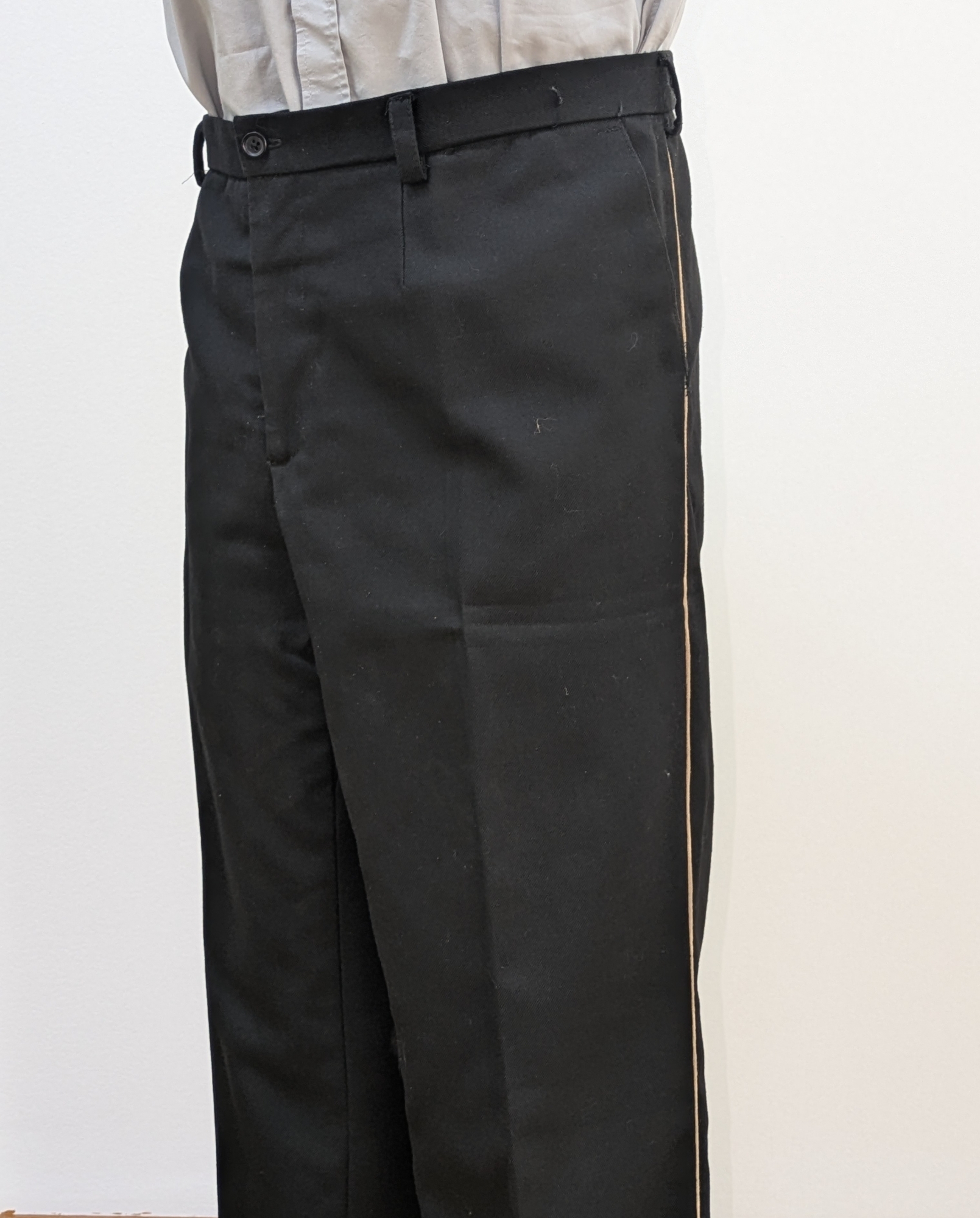 Pantaloni din stofă de lână de culoare neagră. Au croială dreaptă, fără manşetă. Sunt prevăzuţi cu betelie montată, cu buzunare laterale în faţă şi cu un buzunar cu clapă la spate, pe dreapta. În cusăturile exterioare, în lungimea pantalonilor, este inclus un paspoal de culoare cafenie. Şliţul pantalonilor se încheie cu fermoar. Betelia are aplicate găici pentru curea. Pantalonii sunt dublaţi pe partea superioară a feţelor cu căptuşeală.