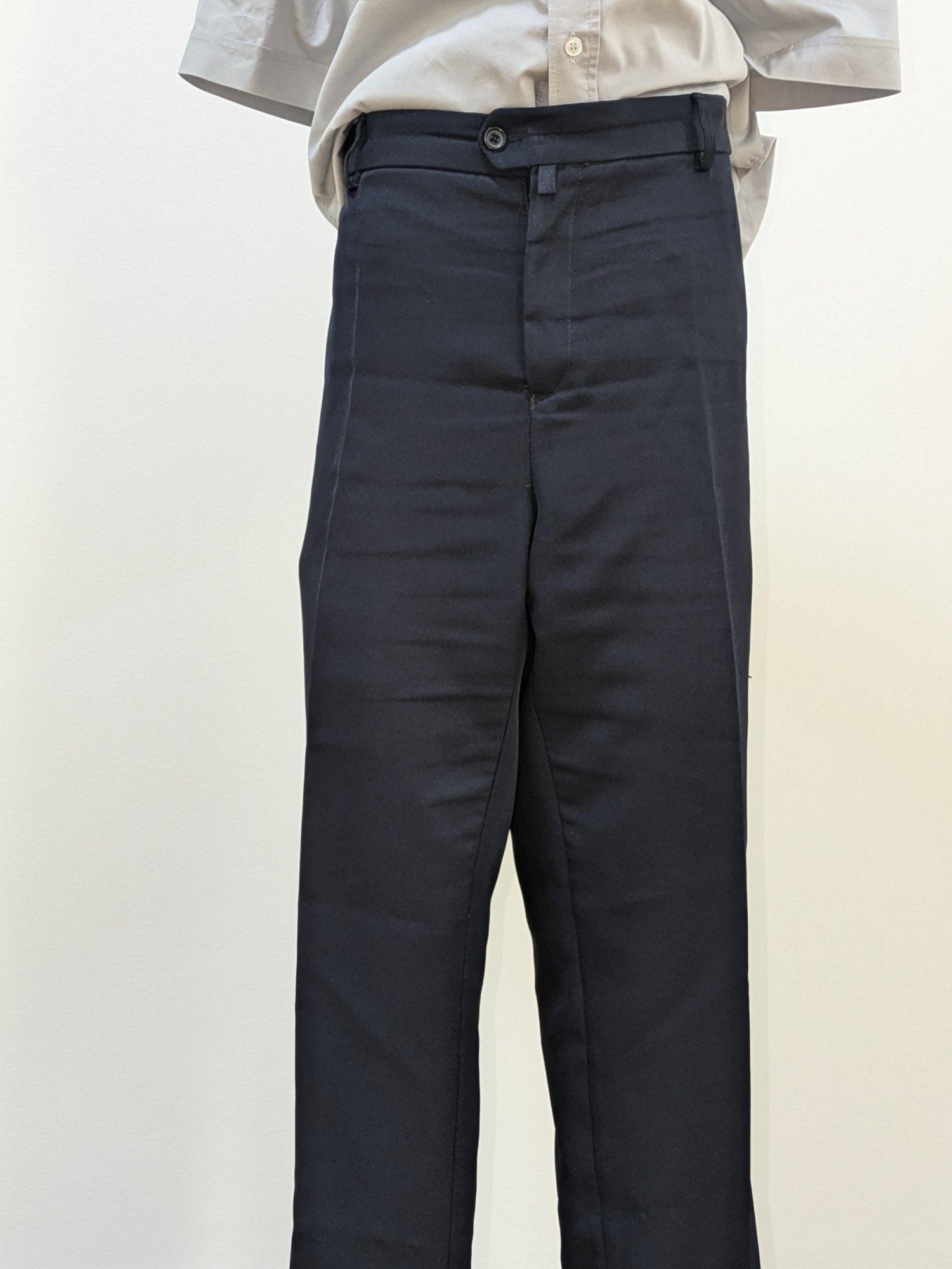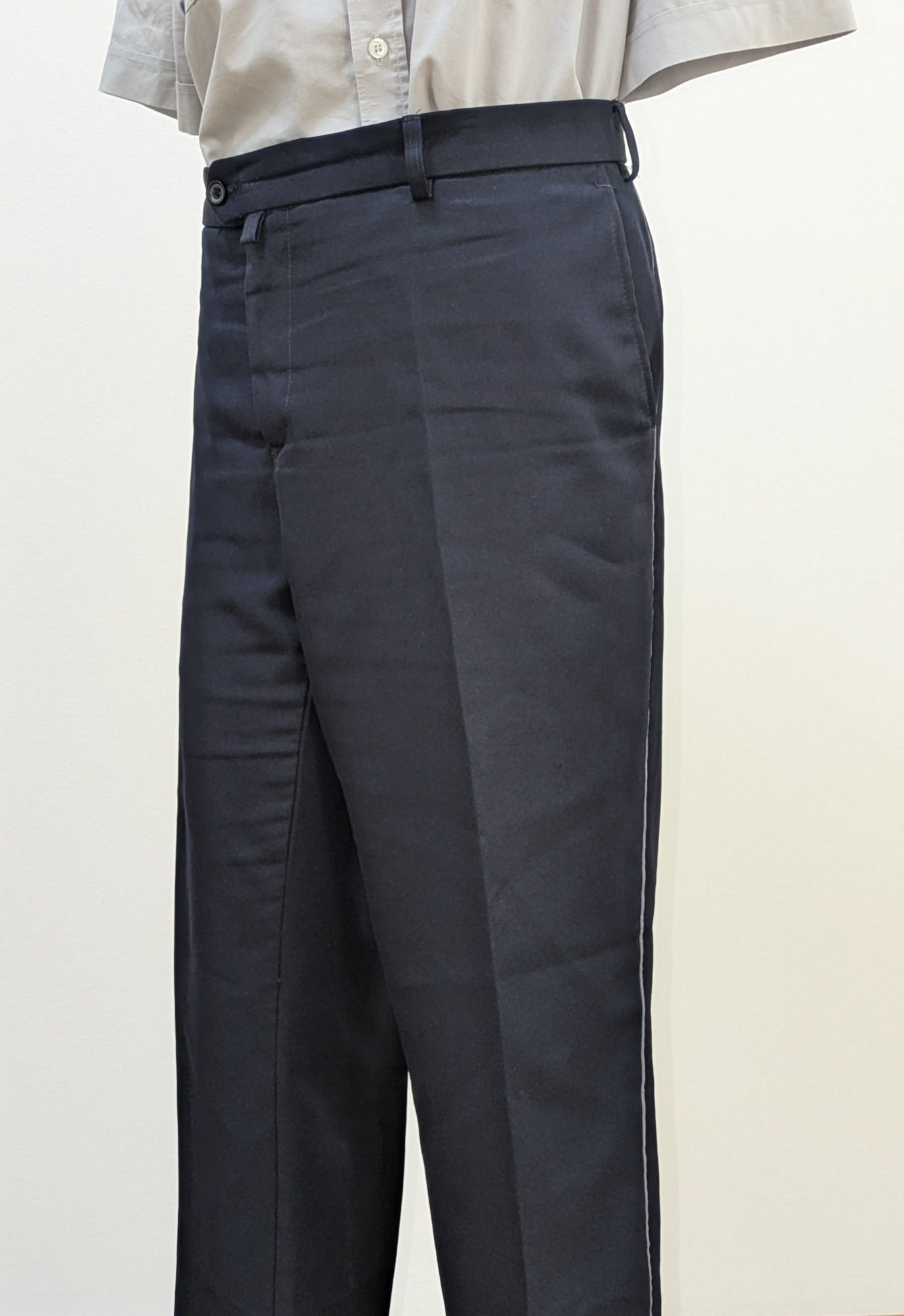 Pantaloni din stofă de culoare albastru-închis. Au croială dreaptă, fără manşetă. Sunt prevăzuţi cu betelie montată, cu buzunare laterale în faţă şi cu un buzunar cu clapă la spate, pe dreapta. În cusăturile exterioare, în lungimea pantalonilor, este inclus un paspoal de culoare gri-deschis. Şliţul pantalonilor se încheie cu fermoar. Betelia are aplicate găici pentru curea. Pantalonii sunt dublaţi pe partea superioară a feţelor cu căptuşeală.